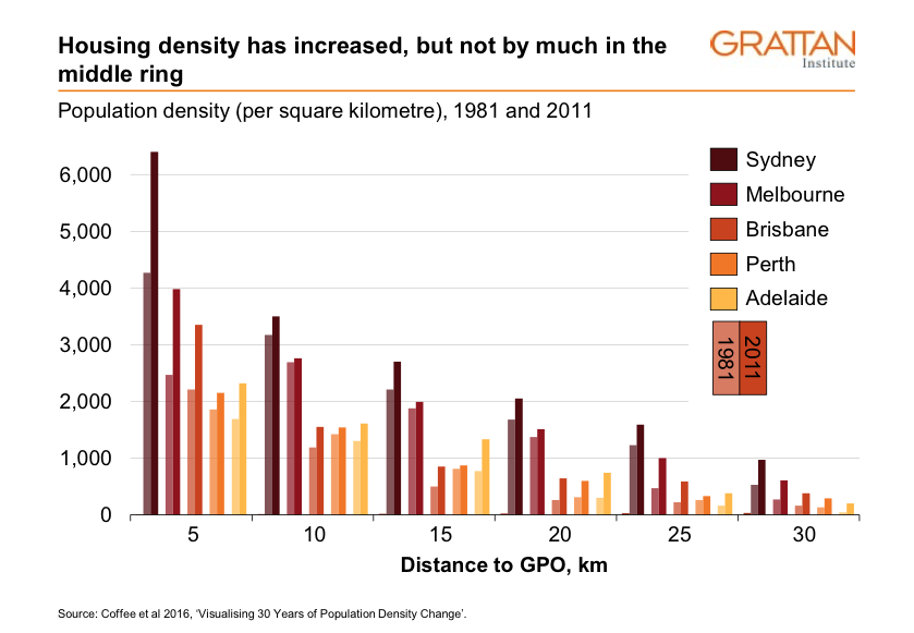 The middle rings of Australia’s large capital cities generally have good infrastructure, and good access to city centres where most of the new jobs are being created. These cities are sparsely populated relative to other large cities in the developed world outside the United States. Grattan research shows that people want more townhouses and semi-detached dwellings in established suburbs.