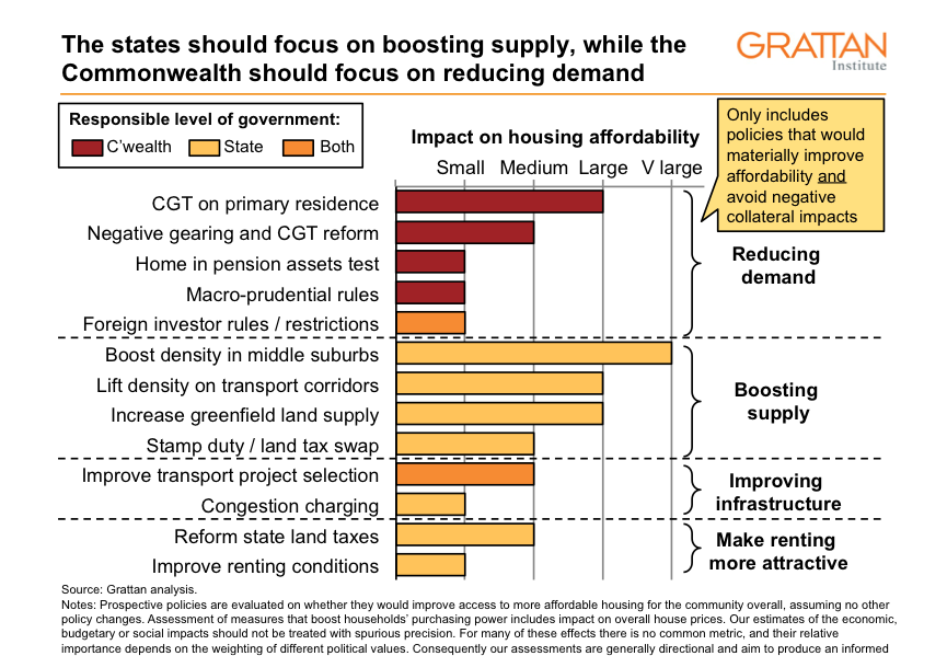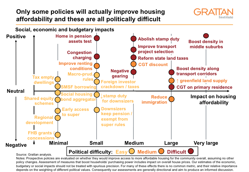So governments need to focus on the policies in the top right of our diagram: policies that will make a material difference to affordability, but won’t substantially drag on the economy or the budget. Everything in this category is politically difficult.