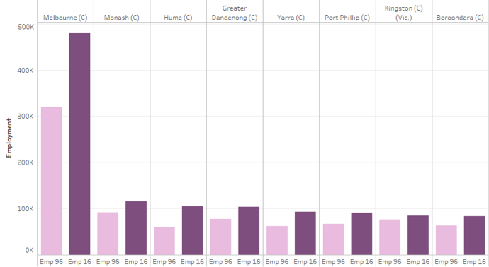 Figure 2 City of Melbourne dominates the Victorian capital’s top 8 councils for employment: job numbers 1996 versus 2016