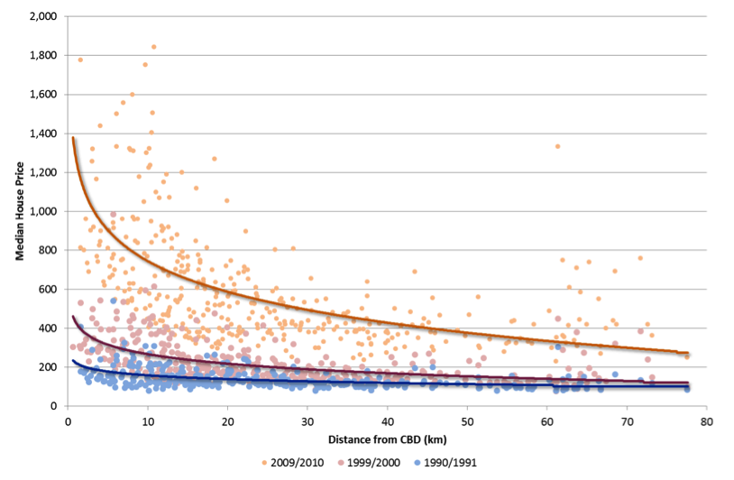 Figure 4 Median house price versus distance from CBD for 1990/91, 1999/00 and 2009/10 – metropolitan Melbourne
