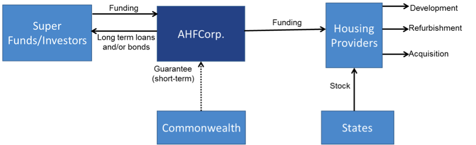 A not for profit entity, the AHFA would liaise with social and affordable housing providers (including CHPs, and others) to determine the amount of debt they seek to raise. It would aggregate these funding needs and source from superannuation funds and other institutional investors. The funds would be loaned to the relevant social and affordable housing providers in return for ongoing interest payments and the return of capital at the end of the loan life.
