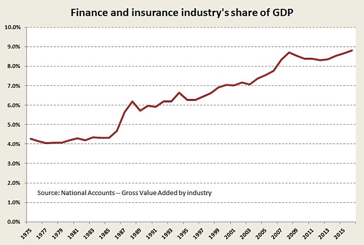 Even though this sector has been the prime beneficiary of information and communication technologies, its GDP share (which is essentially a measure of the sector’s costs) has doubled, as shown in the figure below.