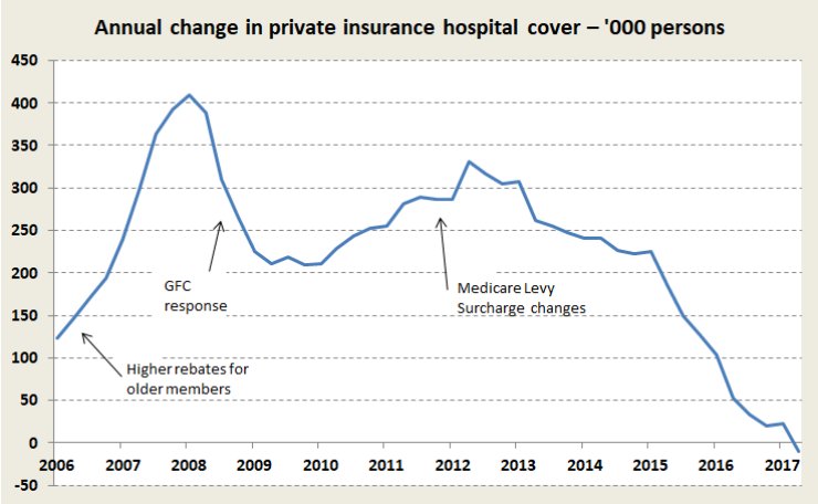 But the industry is begging for yet more support, because its membership is slipping. Hospital coverage peaked in 2014 at 47.3 per cent of the population; by June this year it had fallen to 46.1 per cent. Of even more concern to the industry is the changing nature of its membership: over the year to December 2016 it lost 58 000 contributors aged under 55, while gaining 77 000 older contributors. Up to around age 55, on average, members contribute more than they claim, while past that age contributions don’t keep up with claims.