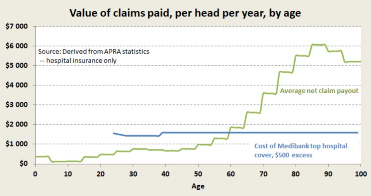The blue line has a couple of kinks, because it models the effect of the new discount as it would apply to someone responding to the Government’s enticement and who takes up PHI at age 25 (the discount cuts out at age 40). That discount still does not make PHI look like an appealing value proposition: there’s still a big gap between premiums and claims paid. It still makes sense, on average, for those who want to use private hospitals, to pay their own hospital bills and to defer taking out PHI until they are in their 50s, even though they would bear a 30 per cent cost penalty under the LHC arrangements.