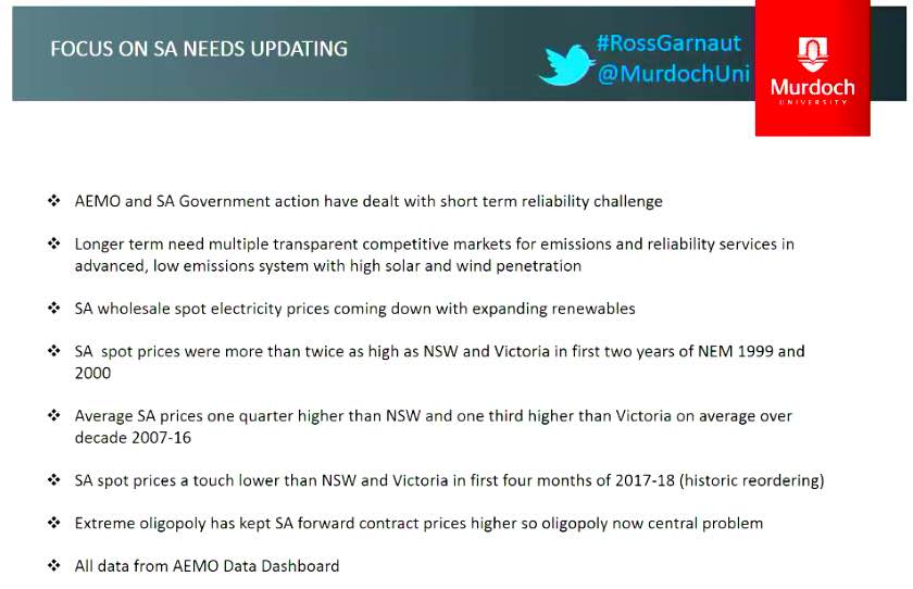 “South Australia gets half of its electricity from wind and solar …. and they are in the process of overcoming their problems and making systems of high penetration of renewables work,” Garnaut said. That is of international interest.”