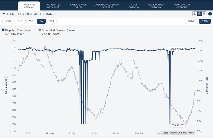 The low levels of grid demand on both Sunday and Saturday in South Australia pushed prices firmly into negative territory. Prices were as low as minus $1,000/MWh on some occasions and averaged minus $120/MWh for two hours on Saturday. It also created record low demand on the grid.