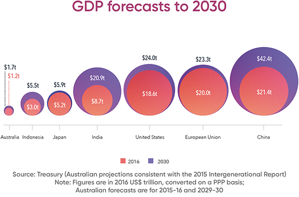 By far the most important and sobering part of the 2017 Foreign Policy White Paper is Figure 2.4. It offers the Treasury’s estimates of the sizes of the region’s key economies in 2030. They are calculated in purchasing power parity (PPP) terms, which adjusts for differences in prices and exchange rates to give a more accurate picture of the relative weight of different economies. The choice of PPP measures is deliberate: it gives the strategists’ view of GDP.