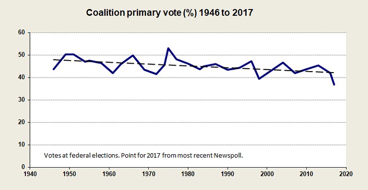 The Coalition’s decline is somewhat different, because although over the whole period it has held up better than Labor, its downturn has been more pronounced in the last twenty years, falling from 47 per cent in Howard’s 1996 victory to around 37 per cent at present – a period coinciding with a drift of the Party to the right, starting with Howard’s purge of moderates in the Liberal Party.