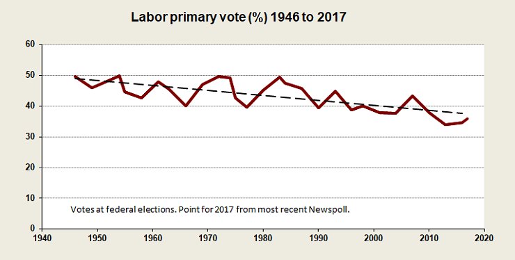Even though Labor has had at least two sudden setbacks – the “split” of 1955 and the Whitlam Government’s dismissal – when viewed over a longer term its decline has been fairly steady.