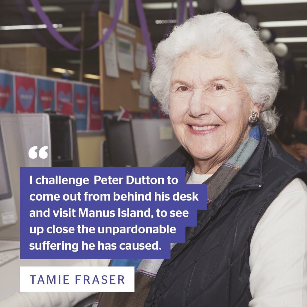 Tamie Fraser, Patron of the Asylum Seekers Resource Centre delivers a message to Peter Dutton