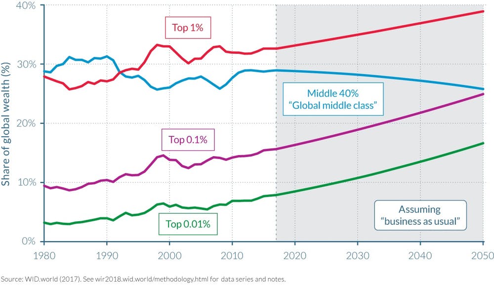 This middle-class squeeze is a long-established trend. The wealth of the top 1% exceeded that of the middle class in the early 1990s, and is projected to reach almost 40% by 2050.