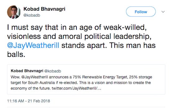 Weatherill’s vision attracted the predictable mixture of bouquets and brickbats, the latter notably from the Coalition, led by energy minister Josh Frydenberg, who just happened to be in Adelaide. See our story, Frydenberg fumes as Weatherill does the vision thing on renewables and storage.