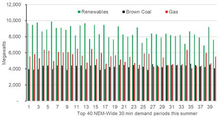 NEM output from renewables, brown coal and gas in the top 40 highest half hour demand periods over summer