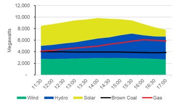 Hydro again lifted in the afternoon, and provided an average of almost 3,300MW across the period that demand was above 32,000MW.