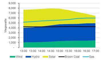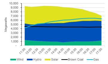 Renewable generation by fuel compared to gas and brown coal by 30 minute interval on the third highest NEM demand period last summer (19 Jan).