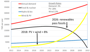 Electrifying the whole energy sector of our economy of course means that electricity production needs to increase massively – roughly tripling over the next 20 years. Continued rapid growth of PV (and wind) will minimise dangerous climate change with minimal economic disruption. Many policy instruments are available to hasten their deployment. Governments should get behind PV and wind as the last best chance to deliver the necessary solution to global warming.