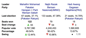 Pakatan Harapan was founded in 2015 with Dr Mahathir as leader and Wan Azizah as the deputy so they become Prime Minister and Deputy Prime Minister. Although a significant figure in her own right, Wan Azizah is the wife of Anwar Ibrahim and got seriously into politics when he was jailed. There was probably a sympathy vote for her husband. Clearly, Mahahtir and Wan Azizah could be presented as serious candidates for Malays who were disenchanted with UMNO. Mahathir’s promise to seek a pardon for the trumped-up charges he had brought against the popular Anwar and which were reinstated by Najib would have helped. While it was UMNO that took the biggest beating, the Chinese MCA didn’t do much better losing 6 seats out of 7 and the Indian Congress lost 2 out of 4.