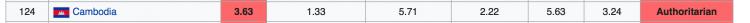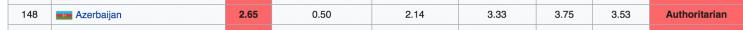 Firstly, you have Azerbaijan and Cambodia, which come 148 and 124 out of the 168 countries on the Democracy Index respectively and are described as Authoritarian Regimes.