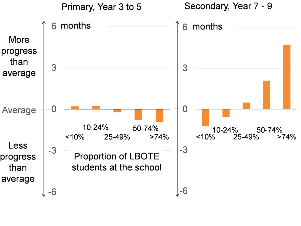 Our analysis compares rates of growth in schools on a like-for-like basis, so that the influence of socio-economic characteristics are taken into account (lower socio-economic status (SES) typically make slower learning progress than higher-SES students). The LBOTE group also includes a small proportion, roughly 11 per cent, of students who speak Indigenous languages at home, whose results are typically much worse than the overall average but not able to be seen here.