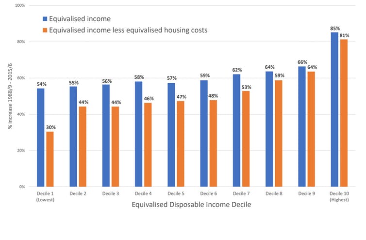 We wish to point out one major flaw in the Productivity Commission’s conclusion. It ignores the deeply polarising impact of the housing boom on Australia in recent years. Our analysis shows that, once rent and mortgage costs are deducted, the rate of increase in average equivalised disposable income of the top 10% of households was 2.7 times faster than for the bottom 10% between 1988 and 2015.