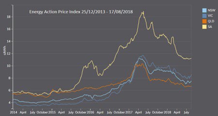 Over much of 2014 power prices were relatively stable or in slight decline. Then around mid 2015, South Australia power prices spiked upwards which was largely a function of the withdrawal of Alinta from the wholesale contract market in advance of the closure of Northern Power Station.
