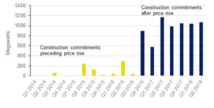 If the insipid amount of renewable energy investment over 2014 to the third quarter of 2016 was so destructive, then you would have thought the huge amount of capacity committed to construction after September 2016 would have been disastrous for electricity prices.