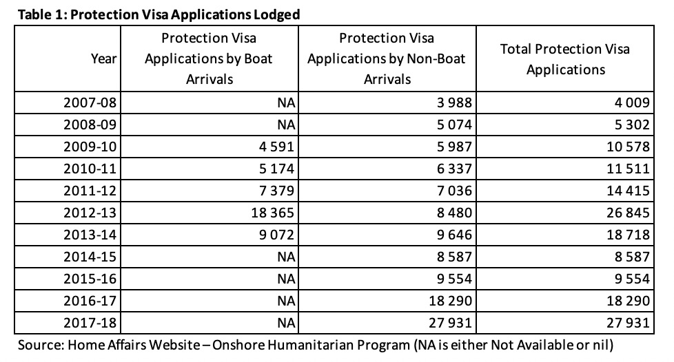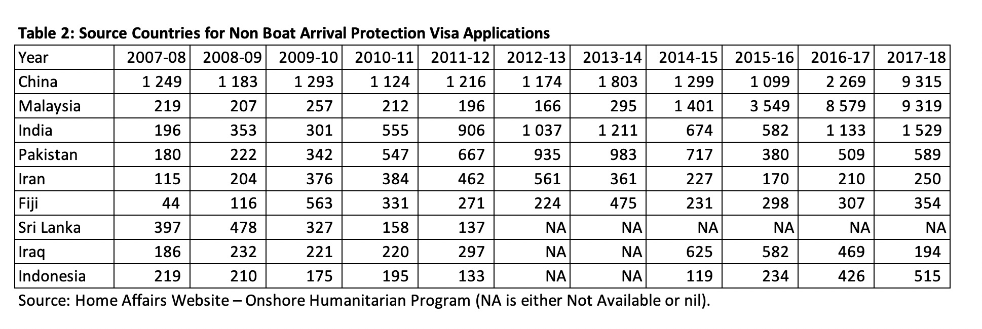 The Home Affairs Annual Report says a large portion of these applications are ‘unmeritorious’. The increase in protection visa applications in the last two years has been driven largely by citizens from China, Malaysia and India (see Table 2). Vietnam has also recently emerged as a major source of protection visa applicants with 867 applications in 2016-17 and 764 applications in 2017-18.