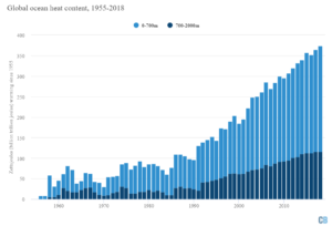 Finally, my graph for this week ( produced by Carbon Brief from Cheng et al, Science Advances, 2017) returns to the issue of the warming of the oceans. The columns show increases in the total heat content of the world’s oceans from 1955 to 2018; the light blue being the increases from the surface to a depth of 700m and the dark blue being at depths of 700-2000m. The total heat content has been rising at both depths since 1955 but the increases became more consistent and accelerated around 1990 when the average annual increase roughly tripled. Ocean heat content change is in some ways a better representation of the effects atmosphere carbon dioxide levels and global warming than change in the average global surface temperature.