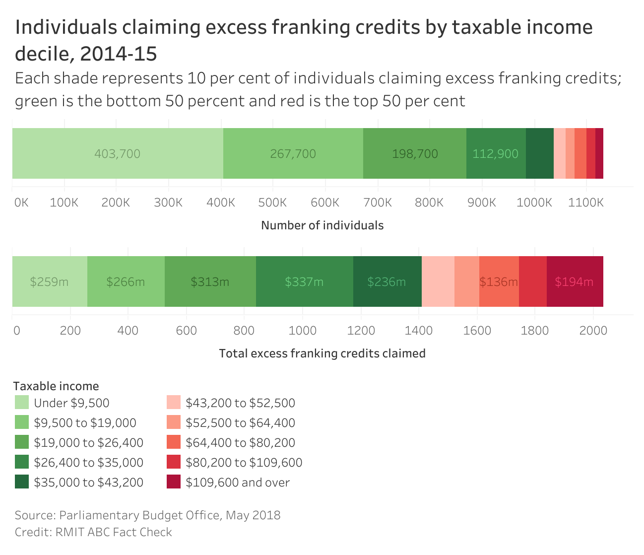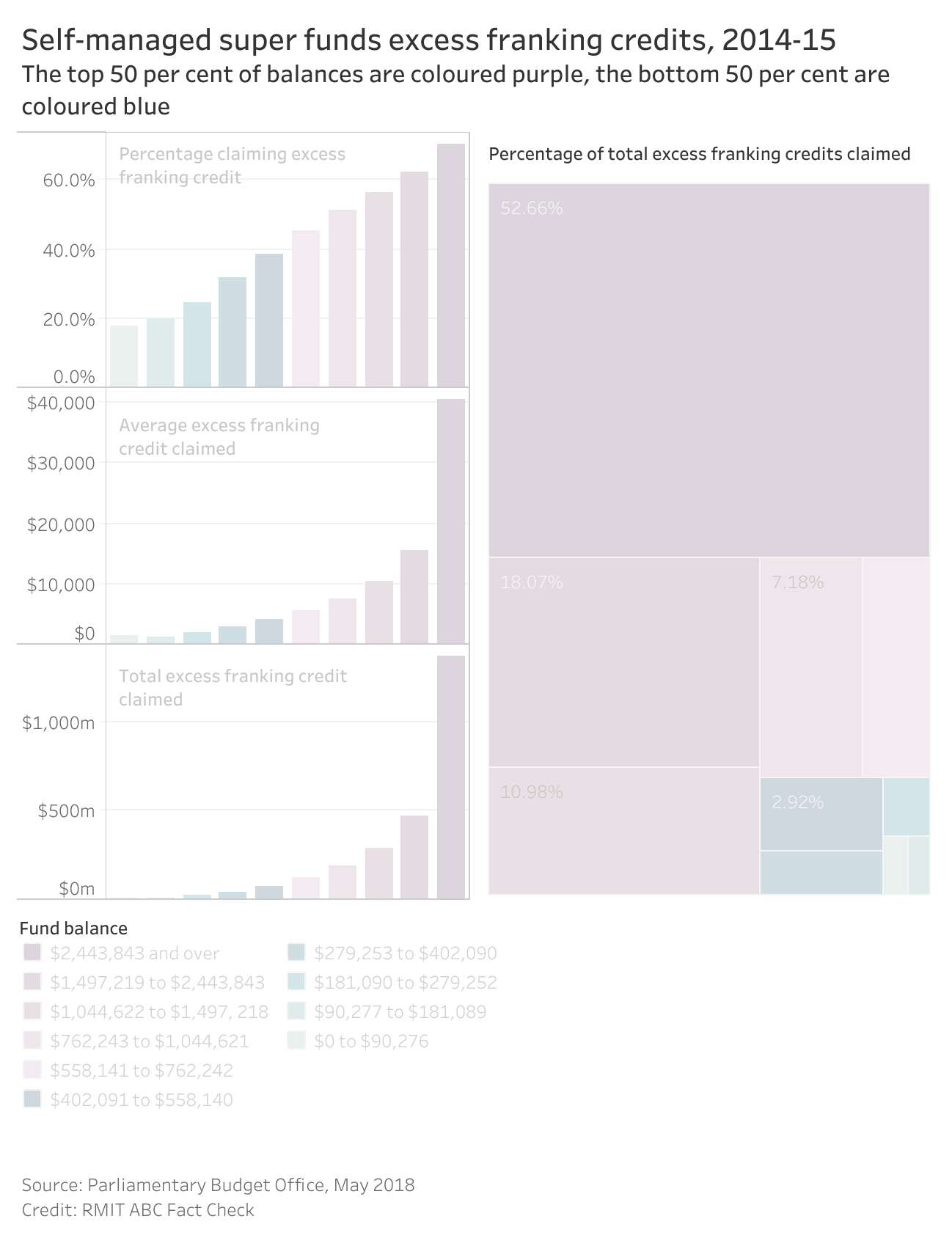 The Parliamentary Budget Office analysed the impact of the policy on this sector, finding that in 2014-15, 201,439 self-managed superannuation funds claimed almost $2.6 billion worth of excess franking credits.