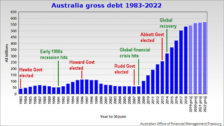 Following the Hawke/Keating Government’s restructure of Australia’s economy, debt was reduced each year from 1987 to 1991 — from $67.2 billion to $48.4 billion. Soon after, the early 1990s global recession required further borrowing, which saw the debt increase again.