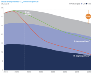 My graph this week comes from a report by McKinsey (page 29) who have, they assert, used their global expertise to compile a ‘Reference Case’ of what the global energy future looks like. The graph below illustrates their prediction that energy-related carbon emissions will increase until 2024 and then fall slowly to be 22% below the peak by 2050. If McKinseys are correct, we’re toast!