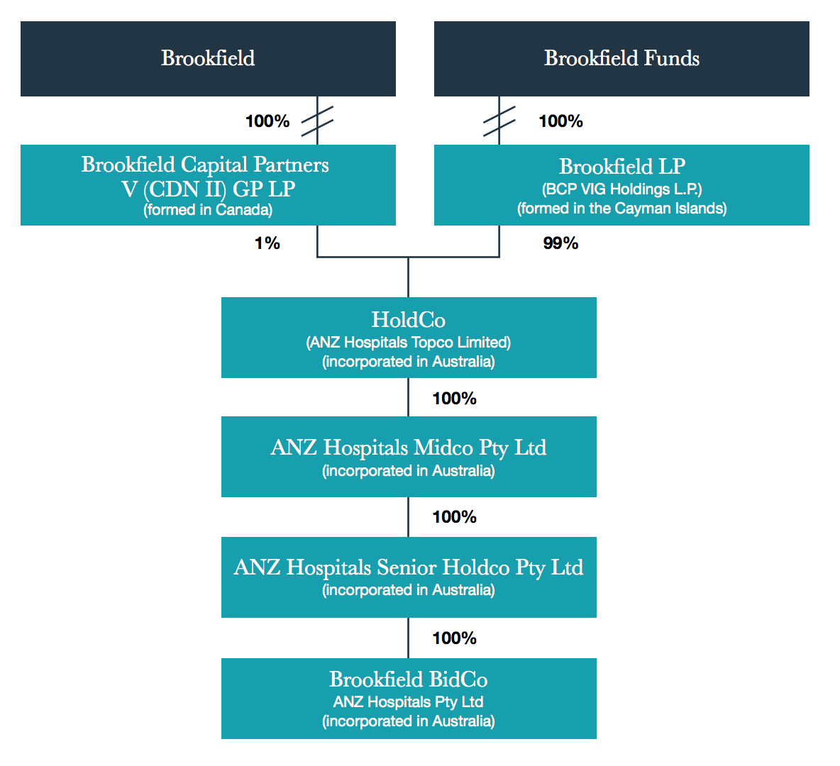 According to takeover documents filed with the Australian Securities Exchange (ASX) by Healthscope, there is a complex structure of companies controlling the hospitals which involves four Australian companies owned 99 per cent by a company incorporated in the Cayman Islands, Brookfield LP (BCP VIG Holdings LP).