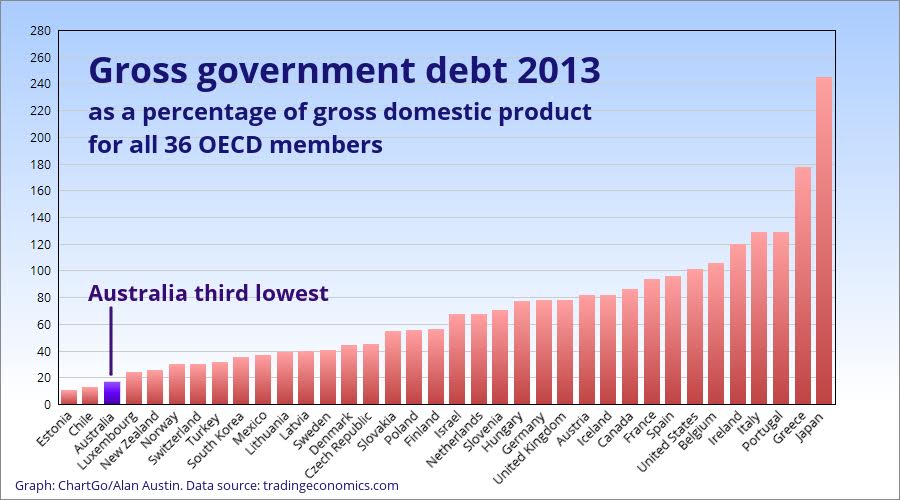 The first chart, below, shows the level of gross debt carried by all 36 wealthy, developed member countries of the Organisation for Economic Cooperation and Development ( OECD) in 2013, when Labor lost office. Australia’s debt to GDP was a very modest 16.8%, the third lowest, behind only Estonia and Chile.