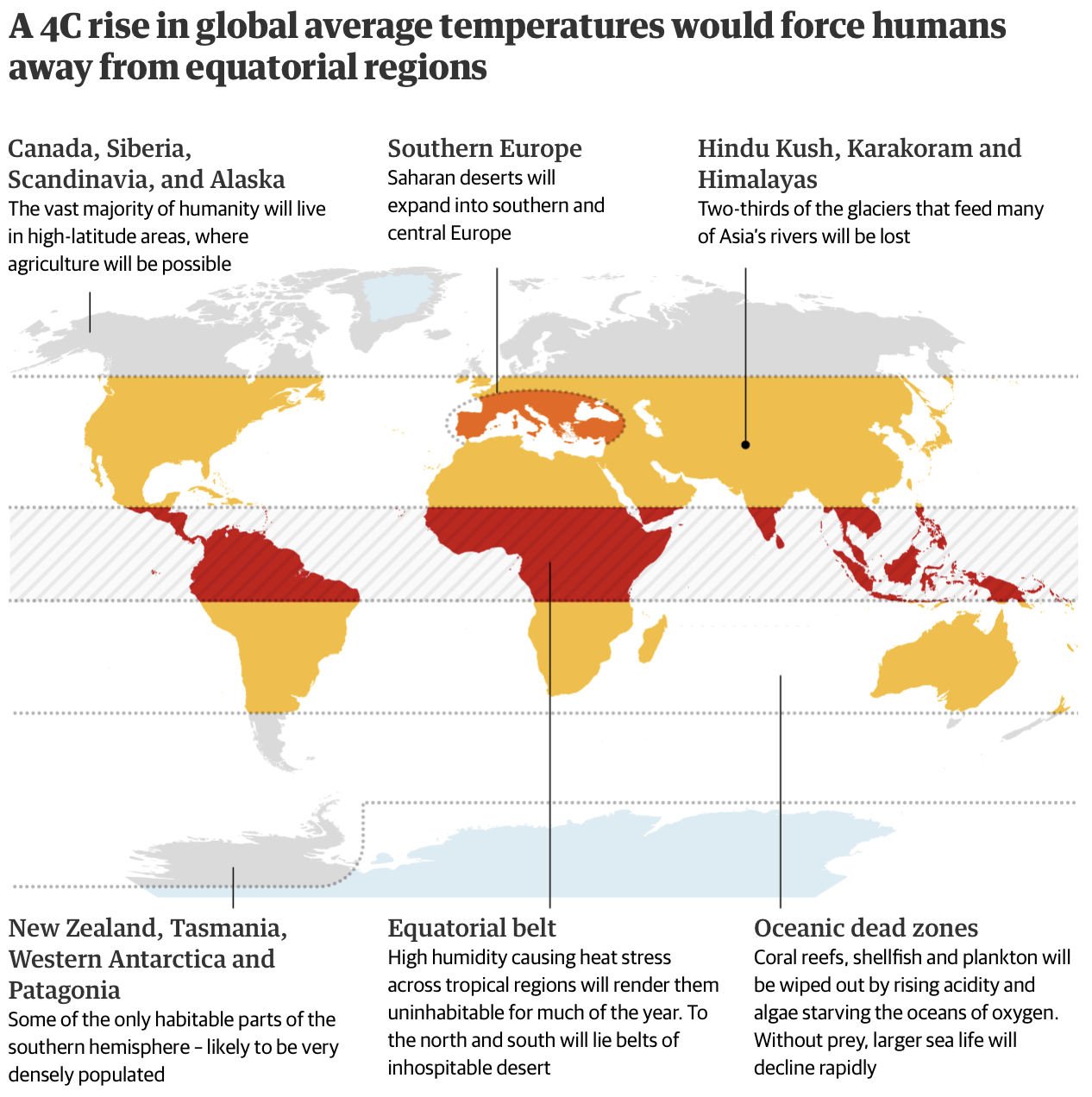 From 2030, more than half the population will live in the tropics, an area that makes up a third of the planet and already struggles with climate impacts. Yet by 2100, most of the low and mid latitudes will be uninhabitable because of heat stress or drought; despite stronger precipitation, the hotter soils will lead to faster evaporation and most populations will struggle for fresh water. We will have to live on a smaller land surface with a larger population.