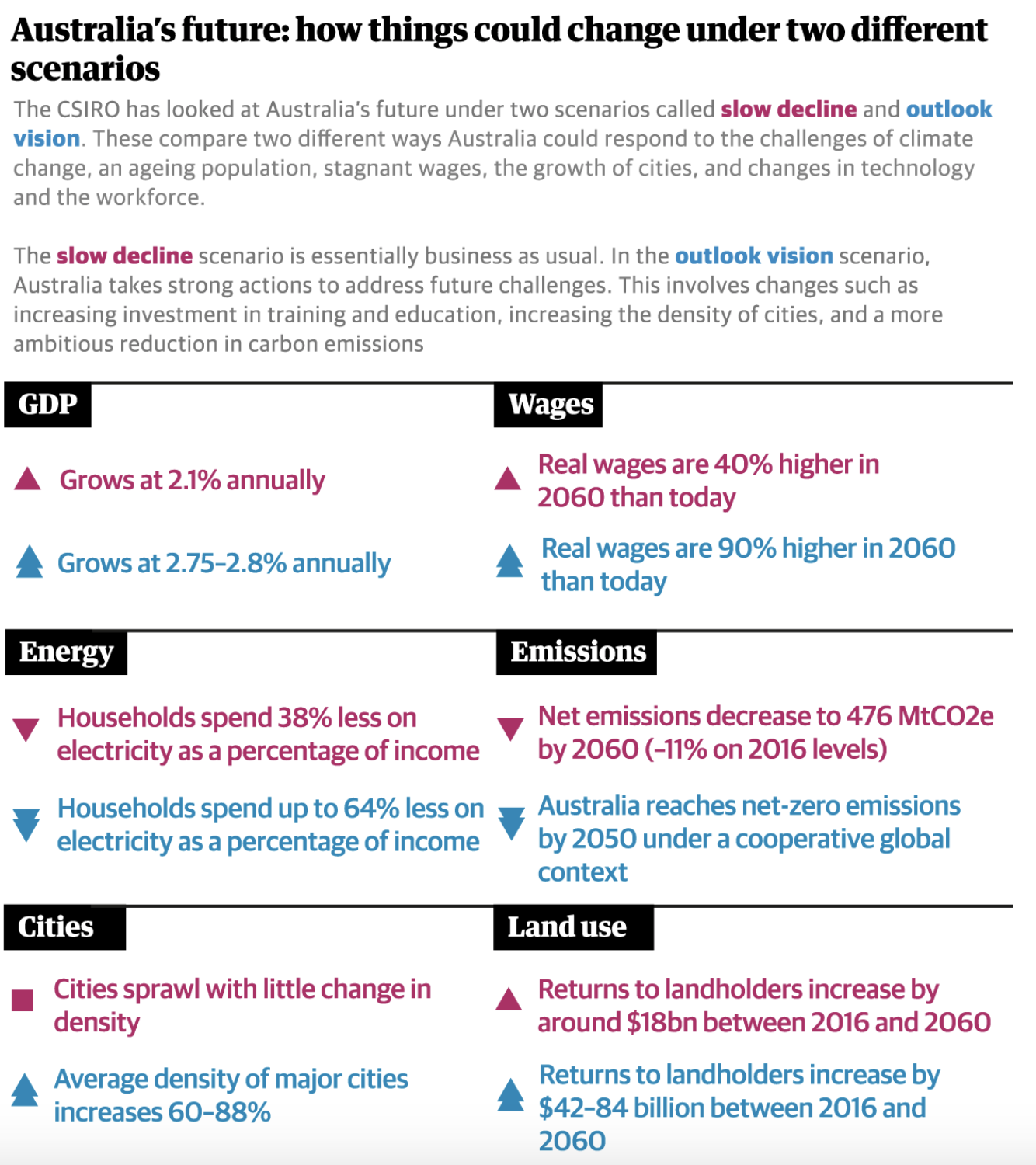 To deal with them and reach its potential by 2060, Australia must make “key shifts” in five areas: an industrial shift, an urban shift, an energy shift, a land shift and a culture shift.