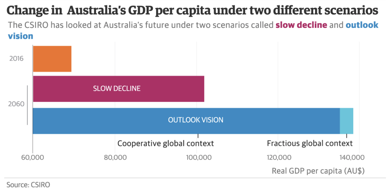 “By using those two scenarios we were trying to illustrate just how different the future is depending on the path that we take. We’re saying that Australians need to get together and these are the things we need to be focusing on. This is what’s really important.”