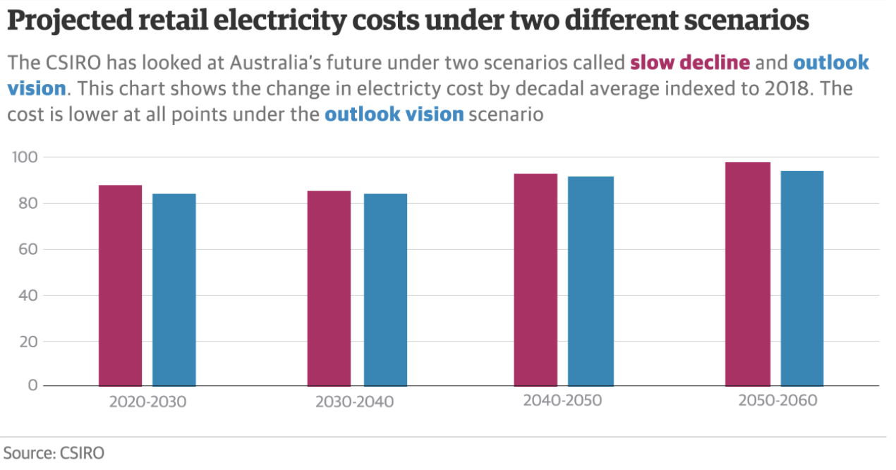 In both scenarios modelled by the CSIRO – slow decline or what the report calls outlook vision – almost all electricity is generated by renewables by 2060 due to drops in the cost of renewables and the decline in the demand for fossil fuels. The global disruption in the energy market is underway, so whether the Australian government encourages new coal-fired power stations or not, renewables will be cheaper and replace them.
