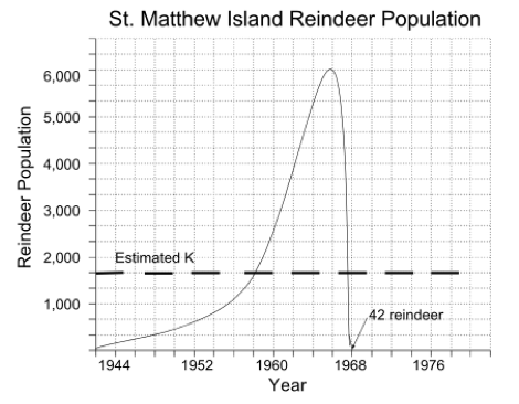 The plot below shows an actual population crash. It is deer numbers over 22 years between the founding of a deer colony on an island, until its near demise. Multiple factors led to distressing deaths in distressing numbers: too many deer, too little available forage, poor prior health due to inadequate nutrition and, finally, a burst of freezing weather. See here