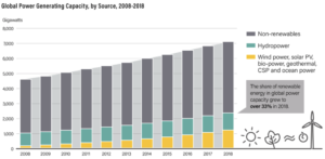 This week’s graph comes from ‘Renewables 2019. Global Status Report’ produced by REN21, the Renewable Energy Policy Network. The report presents further evidence of the widely-recognised falling price of renewables, greater annual investment in new renewable energy sources than new fossil fuel sources, and increasing proportion of renewables in the world’s power generation (all good news). Increases in the number of Gigawatts of energy supplied by renewables and the percentage of total energy provided by renewables (now over 26%) are, however, not what matters when it comes to reducing greenhouse gas emissions. What is needed is a reduction in the absolute amount of power (fewer Gigawatts) provided by fossil fuels, and hence a reduction in the amount of fossil fuels burnt. Until this happens, greenhouse gas emissions will continue to increase. As the graph clearly shows, fossil fuel generation capacity has been steadily increasing over the last decade – from approximately 3,500 Gigawatts/year in 2008 to approximately 4,600/year in 2018. Renewables are not displacing fossil fuels; they are simply mopping up just over half of the increasing demand for electricity. The remainder is supplied by burning more fossil fuels. This isn’t even winning slowly. This is losing rapidly.