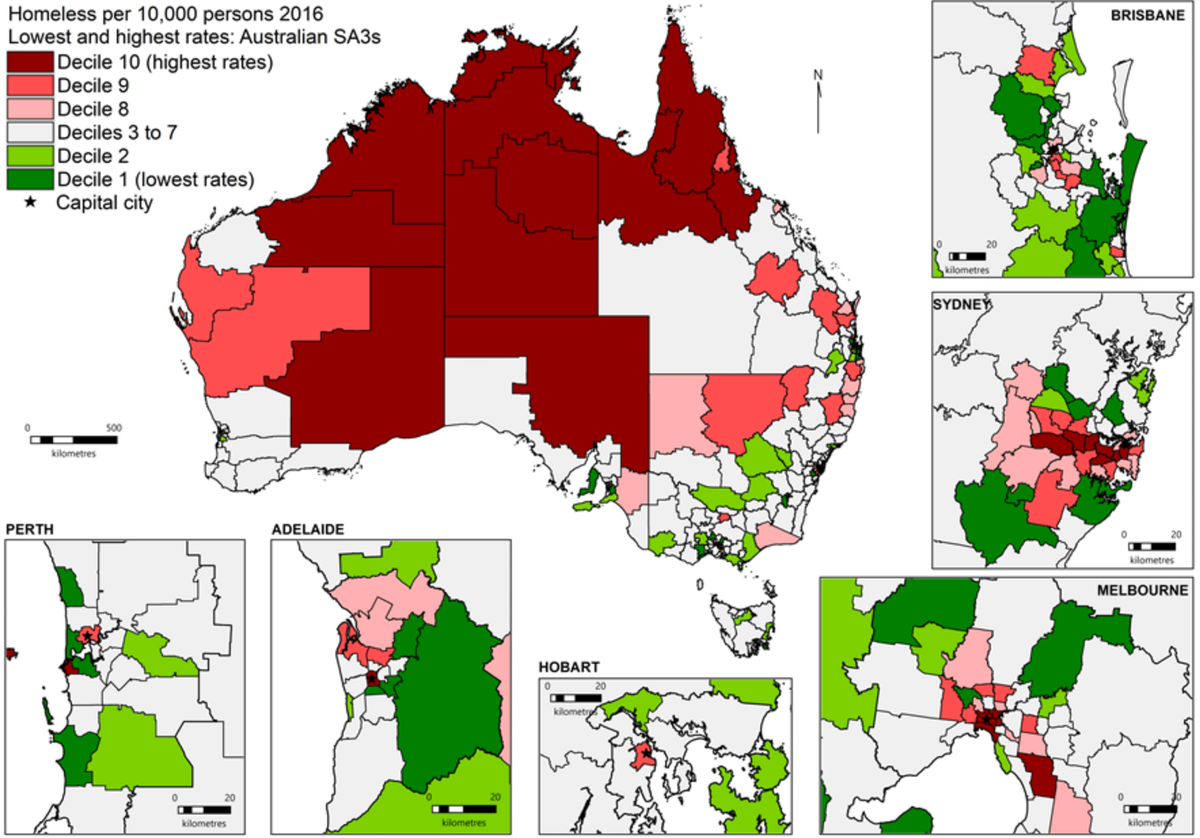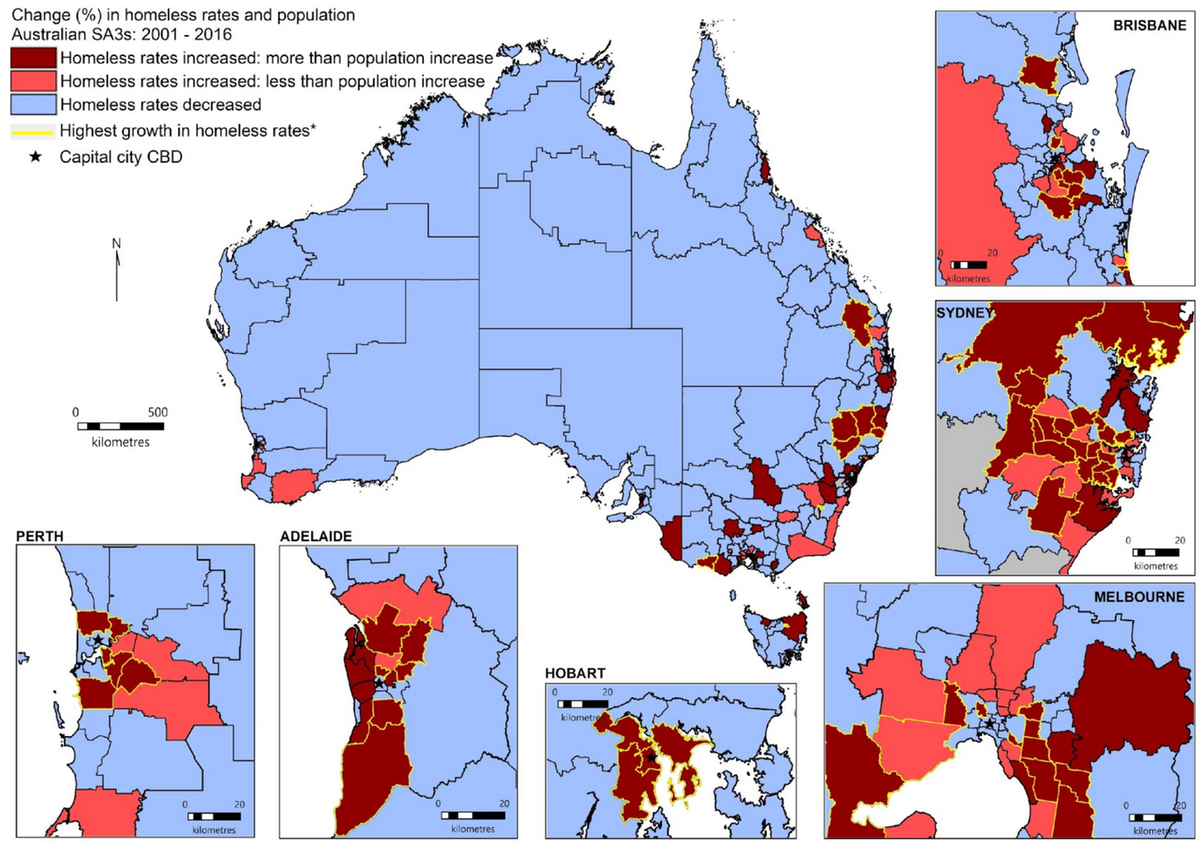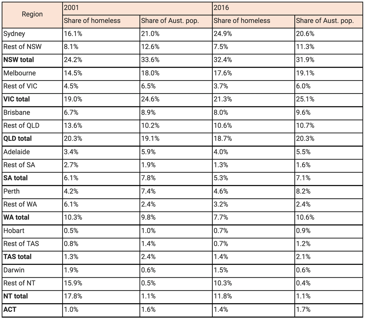 Nationally, 63% of all homelessness is found in capital cities. That’s up from 48% in 2001.