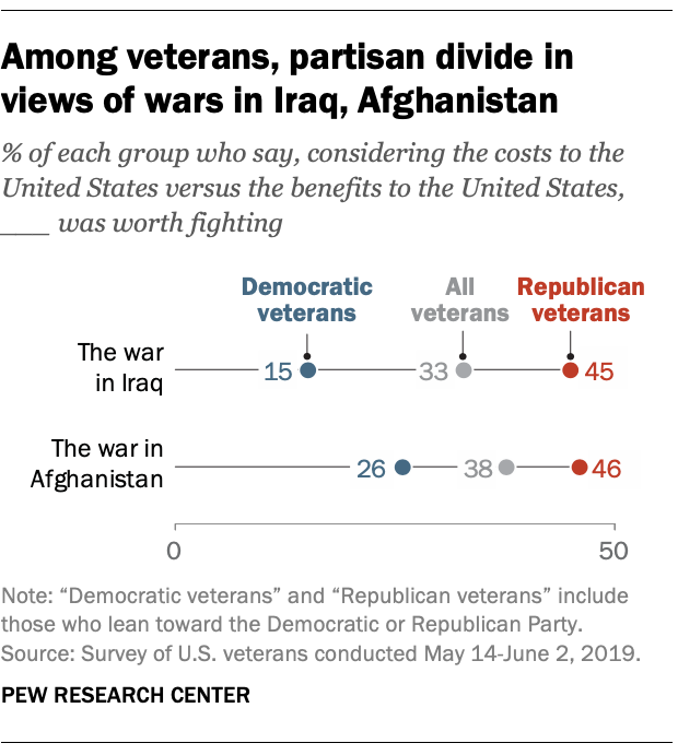 However, Pew pointed out that responses from the general public and veterans differed “significantly” depending on their reported political parties—Republicans from both groups were far more likely than Democrats to say the wars were “worth it.”