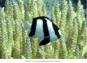 Coral reefs protect fish. Less well known is that fish, including the delightfully-named little beauty below, provide benefits to coral, including providing some protection against coral bleaching and aiding recovery after heat-stress.