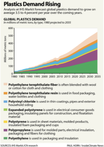 If you don’t know your polyethylene terephthalate fibre from your expanded polystyrene, here’s a graphic outlining the growth in different sorts of plastics. Overall, plastic production has increased approximately 10-fold over the last 40 years and is projected to almost double again over the next twenty. And we know where most of it ends up.