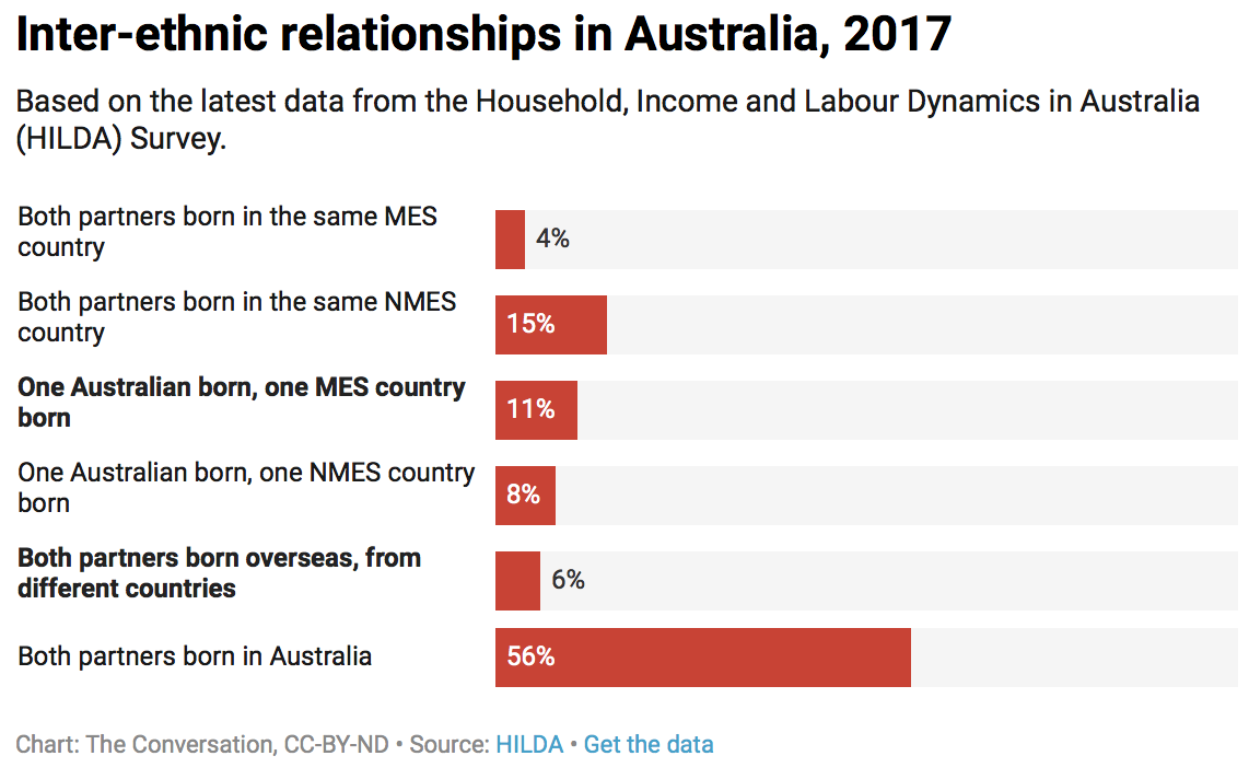 This year, the Household, Income and Labour Dynamics in Australia (HILDA) Survey released data on inter-ethnic couples – couples where the partners were born in different countries – in Australia. The survey found that in 2017, around one in four relationships in Australia were inter-ethnic.
