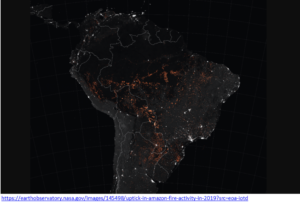 According to reports “climate change itself is making dry seasons longer and forests more flammable. Increased temperatures are also resulting in more frequent tropical forest fires in non-drought years. And climate change may also be driving the increasing frequency and intensity of climate anomalies, such as El Niño events that affect fire season intensity across Amazonia.” The image below clearly shows that the current fires in the Amazon are concentrated along linear access roads, which means the fires are related to land clearing.