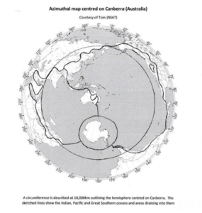Thus, an azimuthal map centred on Canberra with azimuths projected out to include the entirety of the Pacific, Indian and Southern Oceans and the land areas draining into them shows Australia to be towards the centre of an oceanic hemisphere and geographically remote except from the nearby islands of Indonesia and the south west Pacific.