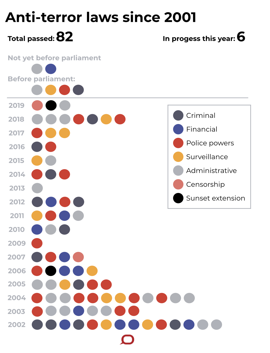 In the five years since then, 19 more anti-terrorism laws have been passed. That brings the total number of substantive anti-terrorism laws enacted by parliament to 82 since the Sept. 11 attacks, with a further six bills either currently before parliament or about to be introduced.