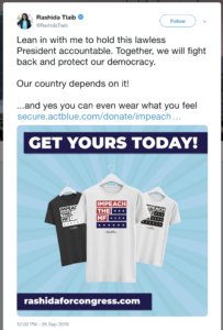 Fifth, for the Democrats, Trump has been the impeachment-in-waiting president until the right trigger. Whatever the excuse or justification, Trump’s real impeachable offence was his election; the rest has been mere detail. The title of Part 1 of this article is from the first Palestinian-American to be elected to Congress. Hours after she was sworn in, Representative Rashida Tlaib (Democrat) from Michigan boasted how after her election victory, she had told her son (!) ‘we’re going to impeach the motherf****r’ Trump [ watch the video here]. Since the impeachment inquiry’s launch, she is proudly marketing T-shirts emblazoned with ‘Impeach the MF’.
