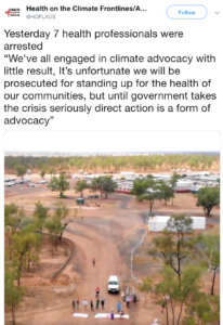 If you’ve been wondering where the Adani Carmichael mine is up to these days, I can report that construction of the mine site is going ahead with lots of national and local subcontractors doing their bit. I know because I and six other health professionals were arrested on Wednesday morning for barricading the construction workers’ camp about two hours from Clermont in central Queensland. Our action had several goals: to obstruct and delay the building of the mine; to highlight that climate change is a major health issue, already damaging human health and causing premature deaths, and that this will inevitably get worse; to pressure the Federal government to take urgent action on the climate emergency and the related health emergency; and to demonstrate, like the ex-fire chiefs, that ‘shouty Australians’ are ordinary Australians who are truly concerned about and committed to protecting the health and safety of our fellow citizens. It is the members of the Federal government, individually and collectively negligent, who are the real threat to safety here.