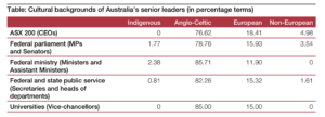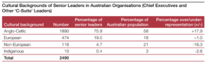 In April 2018, the Australian Human Rights Council (AHRC) published an updated and revised version of its original 2016 study, entitled Leading for Change, on the paucity of cultural diversity in leadership positions across Australia’s many sectors: public service, private sector, universities. It noted that 76 per cent of our population is of Anglo-Celtic and European background, 21 per cent of non-European background, and 3 per cent of Indigenous (Aboriginal or Torres Strait Islander) background. Of the 2,490 seniormost posts in Australia, 94.9 per cent are held by people of Anglo-Celtic and European origin, 4.7 per cent by non-Europeans, and 0.4 per cent by Indigenous people. The report commented: ‘Cultural diversity is particularly low within the senior leadership of Australian government departments and Australian universities’.